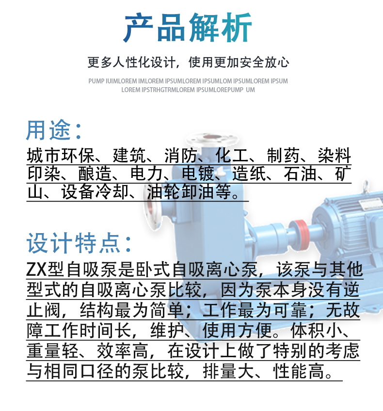 ZX型自吸泵是卧式自吸离心泵,因为泵本身没有逆止阀,结构最为简单;工作最为可靠;无故障工作时间长,维护、使用方便。体积小,重量轻,效率高,在设计上做了特别的考虑与相同口径的泵比较,排量大、性能高。